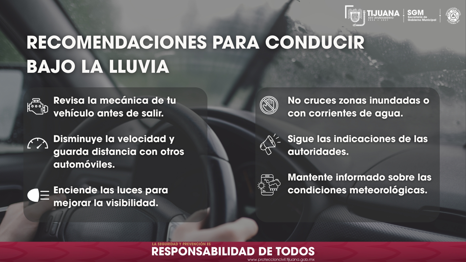 Ante las condiciones de lluvia, Protección Civil Tijuana emite recomendaciones clave para la seguridad vial. Se enfatiza la revisión mecánica previa, la reducción de velocidad, el encendido de luces y evitar cruzar z...